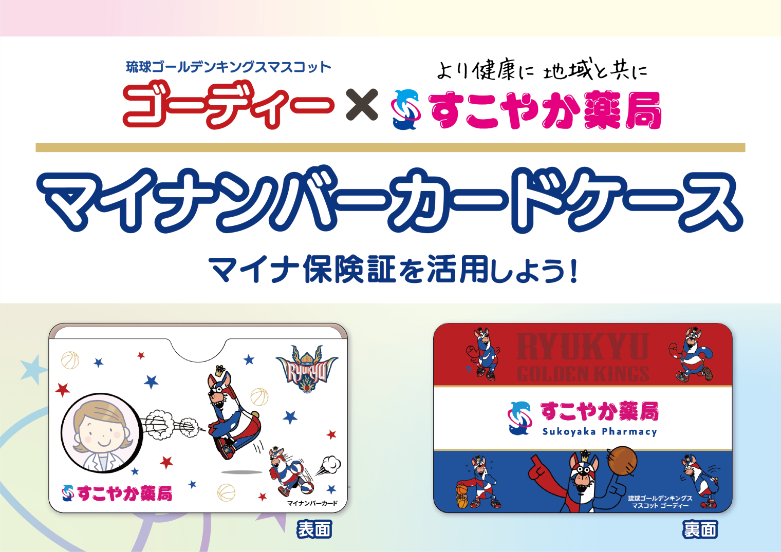 すこやか薬局は、琉球ゴールデンキングスのマスコットキャラクター『ゴーディー』を使用したデザインのマイナンバーカードケースを制作しました。
