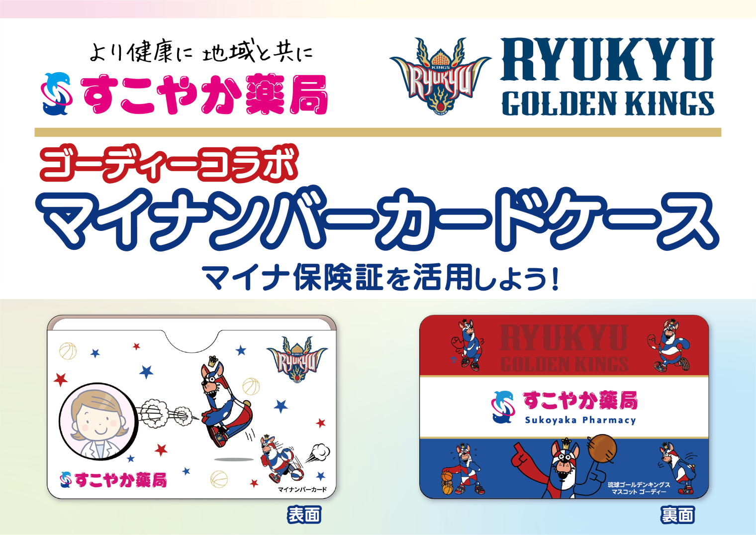 すこやか薬局は、琉球ゴールデンキングスのマスコットキャラクター『ゴーディー』を使用したデザインのマイナンバーカードケースを制作しました。